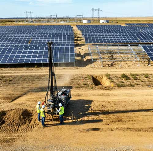 Geotechnical drilling crews collect soil samples and perform subsurface testing that engineers use to design foundations for solar panel arrays, inverter stations, and other infrastructure. Accurate drilling data helps ensure that solar installations remain stable and efficient for decades.